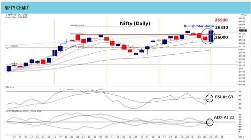 A bullish marubozu on the daily chart marks a strong shift in momentum, reflecting firm buying conviction and complete control by the bulls through the session. The pattern has decisively engulfed the previous four days of decline in a single move, reinforcing the ongoing uptrend and signalling the potential for a strong directional phase in the weeks ahead. Nifty began the December expiry with strength, clearing the key 26050 barrier and extending the rally toward the 26330–26500 zone. Rollover data at 69%, a six-month low, suggests that traders have refrained from carrying shorts forward—often an early sign of expectations of trend reversal or continuation of upward momentum. The 25840 level remains a crucial structural support. Sustaining above this zone has helped maintain the broader bullish trend while establishing a higher base around 26000. For the December series, options positioning shows a firm base in the 26000–25800 range, while resistance zones are gradually aligning toward 26500, indicating improving bullish sentiment beneath the surface. Traders may continue to hold long positions as long as 25840 remains intact, with near-term upside targets placed at 26330, followed by 26500 for the week.