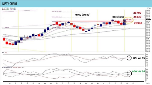 Last week, the appearance of a 'Bullish Marubozu' on the daily chart signaled a sharp shift in momentum, reflecting strong buying conviction and complete control by the bulls. This decisive candle engulfed the previous four sessions of decline, and the subsequent closes above the 5 DEMA reinforced the ongoing uptrend while setting the stage for a potentially strong directional phase ahead. Nifty opened the December expiry on a firm note, clearing the 26050 hurdle and extending gains toward the 26330–26500 zone. Rollover data at 69%, a six-month low, indicates limited short carryover—often an early signal of a trend reversal or continuation of positive momentum. The 25840 level remains a key structural support. Sustained trade above this zone has helped preserve the broader bullish setup while establishing a higher base near 26000. Options data for the December series reflects a strong put base in the 26000 –25800 band, with resistance gradually shifting toward 26500, highlighting improving underlying sentiment. Traders may continue to hold long positions as long as 25840 remains protected, with near-term upside targets at 26330 and 26500 for the week.