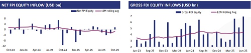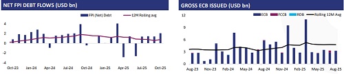 After the INR dropped to historical lows, the RBI opened its dollar purse, and has taken strong measures to defend the rupee. Outstanding net forward position remained exacerbated as of Aug’25 and the RBI sold USD 7.7 bn for this effect. FII flows have recovered in Oct’25 providing some succour, and the impact of hot money flows on the exchange rate will remain a monitorable. Moreover, trade deficit remains prey to change in India’s crude basket and expected bump up in gold imports during the festive period. The silver lining is that despite these challenges, CAD, at ~1% of nominal GDP in FY26, is expected to be well within historical levels. Along with a USD 700 bn forex reserve, it presents a fortress to guard against global swings.