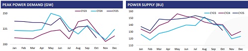 * Unseasonal downpours post Sep’25 led to rainfall exceeding normal by ~44% (as of 6 Nov’25), leading to average maximum temperatures falling by over ~1° C across the country in Oct’25. Consequently, power demand fell 6% y/y due to limited use of cooling equipment. NR had particularly low consumption as higher minimum temperatures reduced heating load