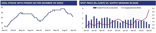 * DAM prices fell 32% y/y to Rs. 2.67/unit in Oct’25 with ample hydro generation boosting supply side liquidity. Prices recovered in early Nov’25 to above Rs. 3/unit