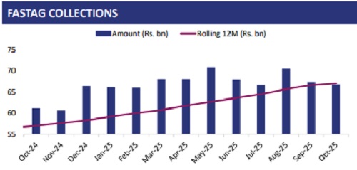 * FasTag collections pace slowed to 9.3% y/y in Oct’25, a seasonal low, with 43.3 mn trips via annual passes denting collections