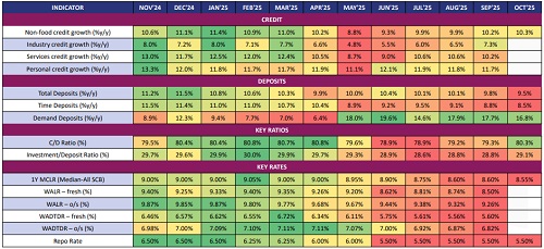 Credit-deposit ratio has crossed 80% once again. We expect that fresh term deposit rates have bottomed out in near term, and this is coinciding with renewed drivers of credit growth. Stocking before the festive season supported a spike in MSME credit in Sep’25, and record vehicle sales and huge consumption expenditure on consumer durables will aid in supporting growth Oct’25 onwards. The spike in gold prices is also providing impetus for gold loans by enhancing borrowing ability. With the outlook for the rate trajectory remaining benign and hope of private large corporate capex still alive, we expect a sustainable pickup in credit growth in the medium term, with bank credit growth clocking 1.3-1.5x of nominal GDP growth in FY26