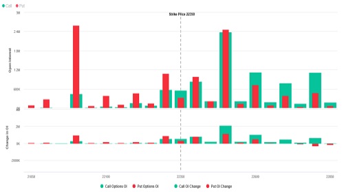 * Maximum Call OI is at 23000 then 22500 strike while Maximum Put OI is at 21500 then 22000 strike.