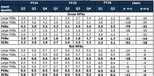 The NNPAs of SCBs decreased by 9.9% y-o-y to Rs 0.88 lakh crores as of Q2FY26, compared with Rs 0.97 lakh crores a year ago. NNPAs of PSBs improved by 19.1% y-o-y to Rs 0.52 lakh crore as of Q2FY26, while NNPAs of PVBs increased by 8.1% y-o-y to Rs 0.35 lakh crore, driven by stress in microfinance and unsecured segments. Sequentially, SCBs’ GNPAs declined by 4.2% in Q2FY26, driven by broad-based improvement.