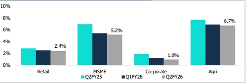 By Q2FY26, sectoral GNPAs as a percentage of total advances for PSBs continued to decline across all segments, reflecting a broad-based improvement in asset quality. This positive trend was supported by significant reductions in fresh slippages and sustained write-offs, as well as tighter underwriting norms in retail lending.