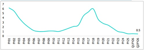 As of March 31, 2018, the NNPA ratio stood at 6%, but has since declined sharply to 0.5% as of Q2FY26, the lowest level in the post-AQR period and stable for the past three consecutive quarters. This sustained improvement reflects the combined impact of large-scale write-offs, steady recoveries from legacy NPAs, stronger provisioning buffers, sales to ARCs and timely resolutions under the IBC framework. While overall asset quality remains robust, the pace of fresh recoveries has stabilised in recent quarters, as the stock of legacy stressed assets continues to shrink.