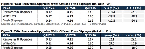 • GNPAs of PSBs declined by 16.3% y-o-y to Rs 2.74 lakh crore in Q2FY26. With the legacy stressed asset pool largely reduced and incremental recoveries moderated, total write-offs and recoveries declined 24.6% y-o-y to Rs 0.25 lakh crore. Fresh slippage also eased, falling 22.5% y-o-y to Rs 0.19 lakh crore, indicating an improving portfolio quality.