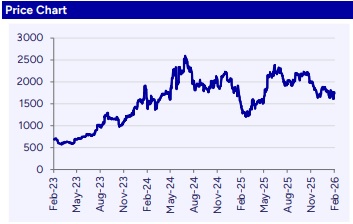 We revised our FY27/FY28E EPS estimates by -3.5%/-2.7% factoring in delay in execution. BEML reported a revenue growth of 23.7%, while EBITDA margin expanded 136bps YoY to 8.3% after adjusting for a one-time provision of Rs800–850mn related to metro projects. Management guided for ~15-20% YoY revenue growth, with EBITDA margins expected to remain in line with FY25 levels (13–14%), supported by largely stabilized supply chains with improving defense and R&M revenue mix. The order book remains healthy at Rs163.5bn, with Q3 order inflows of Rs10.5bn (on a high base), and is expected to reach ~Rs200bn in FY26, aided by healthy domestic inflows across railways, metro and defense along with a potential export order. The proposed Rs15bn greenfield rail manufacturing facility is expected to increase coach capacity from ~200-250 units to ~800 units per annum over time. Additionally, BEML’s focus on TBM development under a clean-sheet design, with a 2.5-year gestation period, targets an estimated India opportunity of ~US$5bn over the next 10 years. The stock is currently trading at a PE of 27.3x/22.1x on FY27/28E. We upgraded our rating from ‘Hold’ to ‘Accumulate’ given recent correction in the stock price with a revised TP of Rs1,922 (Rs1,982 earlier) valuing the stock at a PE of 27xSep’27E (same as earlier).