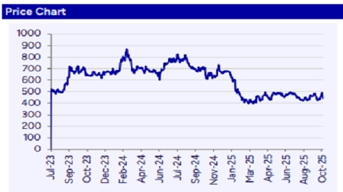 In Q2FY26, CYIENTDL’s margins expanded by ~190bps, driven by higher contribution from the Box-to-Build segment (25% vs 15% in Q2FY25) and a decline in the share of the lower margin Defense segment. The company remains confident of achieving an EBITDA margin above 10% for FY26 and expects book to build ratio of 1.5x. In Q2FY26, the company added two new clients: a Japanese company manufacturing EVOTL vehicles and an EV charging company. The Build-to-Specification(B2S) segment contributes 20% to the order backlog, and the share is likely to increase in the future. For FY26, the company expects growth to be driven by the Aerospace, Industrial and MedTech segments, with a double-digit margin. We cut our earnings estimates by 2.2%/0.5% for FY27/FY28E mainly due to decline in revenues. We have revised TP to Rs478 (Rs485 earlier), based on 25x Sep’27 earnings and maintain our recommendation to ‘Accumulate’. We estimate FY25-28E revenue/EBITDA/PAT CAGR of 20.7%/27.7%/33.8%, with EBITDA margin expanding by ~170bps.