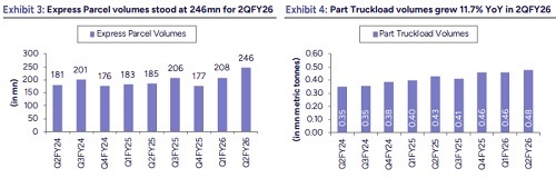 Revenue grew 16.9% YoY: Revenue grew by 16.9% YoY to Rs25,593mn in 2QFY26 (PLe Rs25,182mn). B2C segment’s volume increased 33.0% YoY to 246mn (PLe 231mn) in 2QFY26 while realization was down 6.7% YoY to Rs.65.5/parcel. Consequently, B2C revenue increased 24.1% YoY to Rs.16,110mn (PLe Rs15,560mn). PTL segment saw volume/revenue growth of 11.7%/15.2% YoY to ~0.48mmt (PLe 0.50mmt)/Rs5,460mn (PLe Rs5,581mn) in 2QFY26, while the realization improved marginally by 3.1% YoY to Rs11,447/ton. Supply chain services (SCS) revenue was down 13.7% YoY to Rs1,700mn in 2QFY26. FTL revenue was down 5.1% YoY to Rs1,500mn while cross border revenue decreased 35.6% YoY Rs380mn.