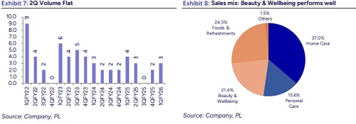 * Personal Care revenues grew by 0.6% YoY; EBIT grew by 21.4% YoY, while margins expanded by 345bps YoY to 20.1%. Growth was Flat impacted by GST rate transition; Skin Cleansing delivered competitive performance led by double digit growth in premium soaps, Oral Care saw marginal decline, while Closeup delivered low single-digit growth.