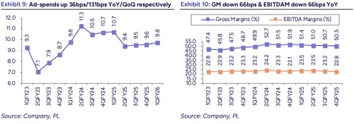 * Beauty & Wellbeing revenues grew by 2% YoY: EBIT declined by 8% YoY, while margins contracted by 283bps YoY to 26.6%. Witnessed 5% Sales growth driven by Skin Care and Health & Wellbeing, Skin Care and Colour Cosmetics grew high single-digit driven by Future Core and Market Makers portfolio. Health and wellbeing sustained strong momentum, led by OZiva’s triple-digit growth.