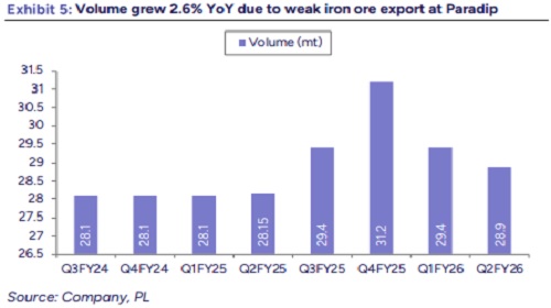 * Overall growth was impacted by subdued volumes at Paradip Iron Ore Terminal (down 2.1mt) due to weak global macro conditions affecting iron ore exports. Otherwise, growth could have been 10%. H2 is expected to perform better than H1, supported by firming iron ore prices in October.
