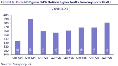 JSW Infra reported decent Q2FY26 operating performance, with robust ports NSR and a growing contribution from the logistics business offsetting tepid volume growth. Cargo volumes were impacted by weak iron ore exports at Paradip Iron Ore Terminal (down 2.1mt YoY), though strong throughput at Jaigarh, Dharamtar, and SWPL partially mitigated the volume loss. Port operations NSR grew 3.4% QoQ to Rs382, driven by higher volumes at better priced Jaigarh and Dharamtar ports, along with rate increases at SWPL and Ennore coal terminals. Volume growth is likely to be supported by the strong steel demand in H2 and the commissioning of the LPG terminal at JNPT.