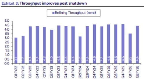 * Throughput improved QoQ: MRPL completed its major turnarounds in Q1FY26 and is currently operating at full capacity. Although throughput fell YoY from 4.58mmt to 4.43mmt this quarter, it improved QoQ from 3.52mmt in Q1FY26. Implied opex stood at USD2.6/bbl vs USD2.6/3.6/bbl in Q2FY25/Q1FY26.