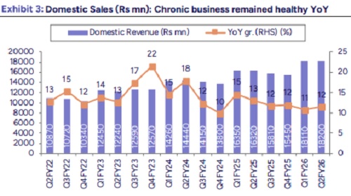 * Key concall takeaways: India: Growth drivers: Volume +3.7%, Price +5.5%, New products +3%. Chronic business grew 13% vs 11% for IPM, led by Cardiac (+14%), Gastro (+15%), Derma (+29%, incl. Curatio). Minimal GST impact (~0.5%); operations normalized post-September rollout. Pricing environment normalized, expecting 5–6% price growth going forward. Field force expanded to 6,800 reps (vs 6,600 in Q1); target 7,000 by FY26E. Expansion largely in Cardiac, Diabetes, CNS.