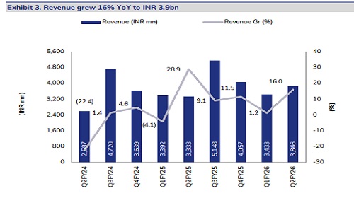 The company reported a healthy all-round performance, beating our estimates on all fronts, with revenue growing 16% YoY to INR 3.9bn (3% beat on our estimates), led by strong offline sales momentum with 20%/35% YoY growth in trade distribution and offline D2C sales. Growth was further supported by the addition of ~200 large format stores, along with contribution from exports and defence sales. EBITDA margin expanded by ~150bps YoY to 12.9% (JMFe: 12.1%), driven by ~100bps gross margin expansion to 53.3% (JMFe: 52.6%), as ASP improved on account of a higher share of premium products priced above INR 1,500 (57% vs. 45% in Q2FY25). The company is undertaking a capex of INR 2.3bn over the next 3 years to become self-sufficient in manufacturing premium sneakers, fully funded through internal accruals. Margins are expected to improve further as the share of these premium products and exports increases in the coming quarters. However, we cut our pre-IND AS EPS estimates by 3–4% to account for higher depreciation and lower other income, given the expected decline in cash balance. We maintain our ADD rating with a revised TP of INR 315 (from INR 310 earlier) as we roll forward to 45x Sep’27 EPS.