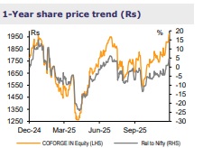 We attended Coforge’s analyst meet, where the management outlined its highlevel strategy and aspiration to continue delivering sustainable and accelerated profitable growth. Key takeaways: 1) The management emphasized on execution intensity remaining vital for its growth strategy, which focuses on four key growth areas: i) big bets centered around strengthening core capabilities in AI-led engineering, data, and ServiceNow while deepening its presence in priority geographies (NA West and Midwest, ANZ) and industries (healthcare, public sector); ii) focusing on structuring large contracts with a proactive approach, with 14 large deals in FY25 and target of 20 in FY26 (10 closed in H1); iii) accelerating scale through key account expansion; and iv) pursuing semi-stressed assets for M&As for client, capability, and market access, and where execution rigor can drive turnaround. 2) Its CY26 IT budget is likely to be better. However, clients view their technology budgets as elastic, adjusting investments to align with changing needs. 3) The management believes the focus verticals (BFS, Insurance, TTH, Healthcare, Government outside India) and service offerings would offer enough growth opportunities and does not see any reason to expand presence beyond these for the next 3-5 years. 4) It intends to maintain FCF/PAT at 70% or above on a quarterly basis. 5) It aspires to achieve EBITM of 14% in FY26 and maintain this as the minimum threshold going forward. We have accounted for the effect of the Cigniti merger in our estimates which has led to a ~5% increase in EPS estimates. We roll forward the target EPS to Dec-27E at 32x; retain ADD on Coforge while raising our TP by ~8% to Rs2,000.