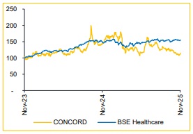 We believe that, while CONCORD will continue to grow, the pace is likely to moderate, given the slower momentum observed in H1. Although management expects a pickup in H2, we think the company will still fall short of its earlier targeted 25% revenue CAGR over the next three years. We now forecast a more conservative 17% CAGR. EBITDA margin is expected to contract slightly in FY26E due to facility ramp-up cost, before normalising back to FY25 levels by FY27 as utilisation improves. Given the tempered growth outlook, we revise our estimate downward by 3.9%/4.0% for FY26E/27E. We also lower our valuation multiple to 30x (from 35x) and arrive at a revised TP of INR 1,615 (vs. INR 1,965 earlier). Hence, we downgrade the rating to ADD.