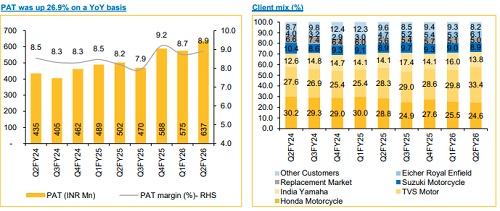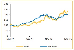 Deep-rooted OEM Partnerships and Resilient Customer Demand: FIEM continues to benefit from robust industry growth, especially in the two-wheeler segment, where domestic production volume grew 10.6%. The performance in Q2FY26 was significantly driven by robust demand from TVS, Royal Enfield and Yamaha. FIEM services the high-volume Classic model for Royal Enfield, holding a market share of more than 90% in this business. We believe this consistent strong performance with key clients, coupled with a robust expected demand in H2FY26 owing to the GST rate rationalisation and a good monsoon, positions FIEM for strong growth.
