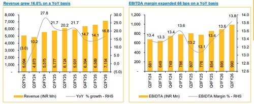 * Revenue was up 16.8% YoY and up 8.6% QoQ to INR 7,154 Mn (vs CIE est. at INR 7,268 Mn).