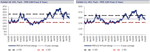 * 2QFY26- Strong well rounded performance: HCLT’s 2QFY26 topline beat expectations. Revenue grew 2.4% cc QoQ vs. JMFe/Cons. est. of 1.2%/1.5%. IT and Business Services was strong (2.6% cc QoQ) – Lifesciences and healthcare/Public services led with 4.4%/7.8% QoQ growth (USD). Products and platforms growth was soft at 0.5% cc QoQ (-3.7% YoY) offsetting some of the strength in services. Softness in products was due to decline in perpetual license revenue as the company shifts its focus towards subscription. EBIT margins expanded 116 bps QoQ to 17.4% vs JMFe/Cons. est. of 17.1%. Increased margins in software (+30bps), absence of one-off impact (+30bps), higher utilization (+50bps), FX (+56bps) aided margins partially offset by restructuring (-55bps). PAT came in at INR 42.4bn, marginally missing expectations (vs JMFe/Cons. est. of INR 43.2/43bn). LTM FCF/PAT was 125%.
