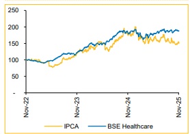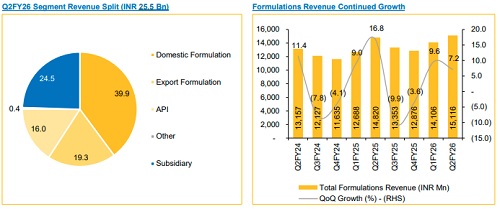 API segment delivered robust growth of 28% YoY, driven by new business wins from European customers and bulk orders in high-margin products. We expect Europe and LATAM to remain key growth contributors, with segment growth projected at ~12% in FY26E. Formulations, however, may witness near-term moderation as the company focuses on API-backed filings to strengthen longterm sustainability. Gradual improvement is expected from Q4FY26, supported by the scaling up of new launches in the US and synergy gains from the Unichem acquisition. In the domestic formulations market, we anticipate a favourable product mix shift towards chronic therapies and potential benefits from GST rate rationalisation. Overall, we project consolidated revenue growth in the high single to low double digits for FY26E.