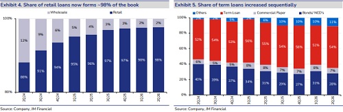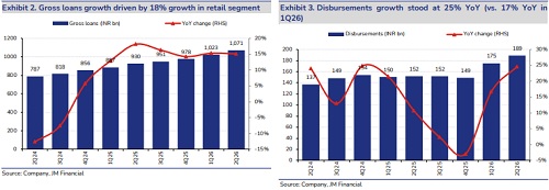 Disbursements growth during the quarter was strong at (+25%/8% YoY/QoQ both) majorly led by pick-up in consumer loans (+50% QoQ), 2W (+18% QoQ), SME (+15% QoQ) and rural BL (+13% QoQ). Farm equipment de-grew (-25% QoQ), MFI (-11% QoQ) and HL (-4% QoQ) segments. As a result, overall growth came in strong at +5% QoQ, +15% YoY. Within the retail book, growth was driven by PL (+16% QoQ), gold loans (+8% QoQ), LAP (+8% QoQ), SME finance (+7% QoQ) and 2W (+6% QoQ). The company aims to add 70+ gold loan branches (currently at 130 branches) by FY26E which will also cross-sell microLAP, SME and PL. Wholesale book remained largely flat QoQ. Management guides for 20- 25% AUM growth for FY26E led by Project Cyclops and government initiatives such as GST rationalization. We build in gross loan growth of ~19% CAGR over FY25-27E (~21% CAGR in retail loans).