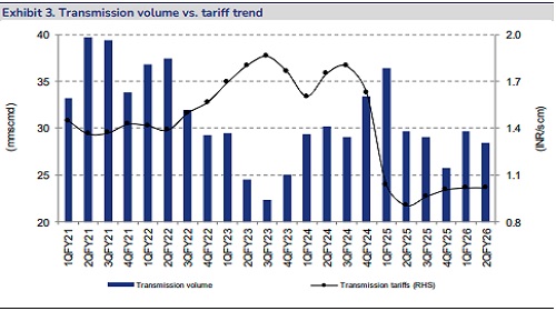 * Implied transmission EBITDA margin was lower at INR 632/tcm vs. JMFe of INR 700/tcm due to higher opex and slightly lower transmission tariff: Implied transmission EBITDA margin was lower at INR 632/tcm vs. JMFe at INR 700/tcm (vs. INR 714/tcm in 1QFY26) on higher cash opex at INR 772mn or INR 385/tcm vs. JMFe of INR 330/tcm (vs INR 633mn or INR 302/tcm in 1QFY26); further, weighted average tariff was also slightly lower at INR 1,017/tcm in 2QFY26 vs. JMFe of INR 1,030/tcm (and vs. INR 1,016/tcm in 1QFY26).