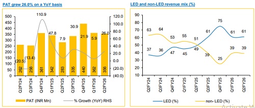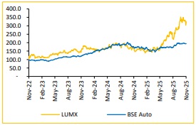 LUMX Mitigating Margin Pressure through Operating Leverage and Localisation Efforts: LUMX saw an improvement in EBITDA margin in Q2FY26 on YoY basis. Higher utilisation at the new Chakan plant Phase-1 helped with improved operating leverage. It was further aided by the localisation efforts undertaken by the company for some of the components for LED lighting which are imported (currently achieved localisation at 20–25% and going forward, expected at 50–55%). We expect EBITDA margin to improve, going forward, driven by operating leverage and increasing localisation efforts to source components for the LED segment.