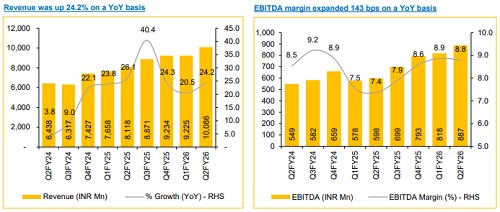 * Revenue was up 24.2% YoY and up 9.3% QoQ to INR 10,086 Mn (vs CIE est. at INR 9,728 Mn).