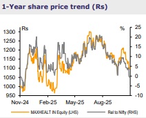 Max reported network revenue growth of 21% YoY to Rs25.7bn, in line with the street’s estimate, as IP volumes grew 22.5%, while overall ARPOB rose 1.4% YoY. EBITDA was reported at Rs6.7bn (+24% YoY), with the margin growing by 53bps YoY as the increase in employee costs (+17% YoY) and other expenses (+18% YoY) was outpaced by growth in revenue. Adj PAT came in at Rs4.1bn (+16% YoY) despite the increase in D&A (+26% YoY) and interest (over 8x) costs. Maxlab/Max@Home reported revenue growth of 16%/20% YoY, respectively. FCF was Rs2.9bn and net debt was Rs20.7bn (Sep-25). Capex was Rs4.6bn.