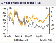 We downgrade ONGC to ADD from Buy, while retaining Sep-27E TP of Rs280 (~7.5x consol target P/E), with value of listed investments now higher. ONGC’s Q2FY26 SA EBITDA of Rs166.0bn missed our estimate by 2% albeit on higher forex loss, while PAT of Rs98.5bn beat our estimate by 2% on lower tax rate due to dividend income. Survey and Dry Wells costs were lower at Rs11bn vs Rs13bn estimated. Total crude production rose 0.6% YoY to 5.2mmt (inline), while gas production fell 0.6% YoY to 5.0bcm (1% miss). NWG contributed to 21% of NB gas revenue in H1. KG 98/2 crude production fell to 28kbpd. The mgmt is optimistic about output growth from Q4FY26, backed by green shoots from BP TSP, 98/2 gas ramp up as key facilities get installed, and increased production from Daman. It should see full impact from these assets in FY27 and Daman qualifying as NWG. ONGC also targets Rs50bn opex savings over time – started taking initiatives. We lower FY26-28E SA EPS by 9-13% each, building in lower Brent price (USD65/bbl), though partly offset by weaker currency.