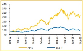 PSYS has achieved a robust 28% CAGR over the past 4 years, outperforming several peers even before the AI surge. The company focuses on its top 100 clients, representing over 82% of revenue, aiming to capture significant AI-related market share backed by its AI powered digital engineering platform SASVA. Successful wins against Tier-1 competitors, in Q2FY26, including a major financial services consolidation deal, highlight its strategic strength. Additionally, the company plans to implement contractual clauses to secure price increases for experienced resources, ensuring steady margin growth. Given this outlook, we expect Revenue/EBIT/PAT to expand at a CAGR of 18.2%/24.2%/23.9%, respectively, over FY25–FY28E and maintain our ADD rating with a target price of INR 6,050.