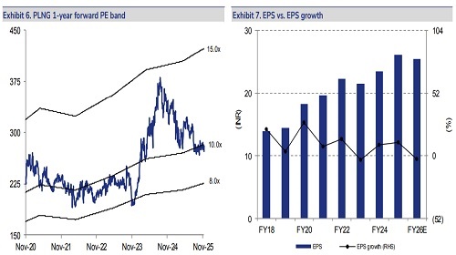 * Maintain ADD on valuation grounds; but capital misallocation risks continue to exist: We maintain ADD on PLNG (unchanged TP of INR 305) on valuation grounds but capital misallocation risks continue due to the management’s aggressive capex plans in the non-core petchem business, which could be value-destructive as they are outside PLNG’s core competence amidst muted outlook for petchem margins given surplus global capacity. At CMP, PLNG trades at 9x FY28E P/E (3-year avg: 10.6x) and 1.5x FY28E P/B (3-year avg: 2.1x).