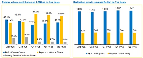 * Net revenue for Q2FY26 was at INR 14.9Bn up 33.8 YoY and down 0.8% QoQ (vs CIE est. at INR 14.7Bn) driven by a 21.7% and 79.6% surge in P&A and Popular category volumes, respectively.