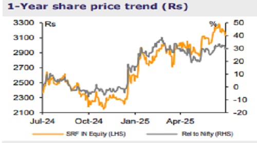 SRF’s Q1 EBITDA at Rs8.3bn (+38% YoY/-13% QoQ) was in line with consensus/our estimate of Rs8.3bn. Healthy YoY performance was driven by a) better refrigerant gas pricing in exports market which was offset by lower domestic volumes, b) volume recovery for key agrochemical intermediates in specialty chemicals, and c) higher realizations and increased volumes of BOPP due to a fire incident at a domestic competitor’s plant. The management maintained its FY26 guidance for chemicals business revenue growth at +20%; capex guidance was raised to ~Rs25bn for FY26 (vs Rs12bn spent in FY25). The company expects newly launched products in specialty chemicals to ramp up, and a firm pricing environment in refrigerant gases (given the current demandsupply situation) in FY26. We retain ADD with an unchanged TP of Rs3,25