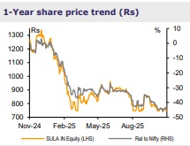Sula has reported 1% decline in revenue from operations, with own-brand revenue seeing a 2.5% decline. This fall is owing to temporary route-to-market disruption in Telangana (with ~15% revenue mix); adjusted revenue growth stood at a mid-single digit. With Telangana retail set to bounce back to normalcy from Dec-25, we expect offtake to see improvement from Q4FY26. Amid own brands (89% of revenue), Sula’s Elite and Premium offerings saw 3% YoY decline; here, double-digit growth was seen in eight states, including Haryana, Rajasthan, and Uttar Pradesh. The Source range (10% mix) continues to thrive with healthy double-digit growth. Revenue in the economy and popular segment stood firm YoY at Rs275mn, where its Samara and Port brands saw double-digit growth. Wine tourism (~9% of revenue) saw 7.7% YoY revenue growth. Sula has opened its 3rd resort – The Haven by Sula (30 keys), in Sep-25. Occupancies for Q2 saw a 300bps YoY expansion to 77%, while ARR improved 1% YoY to Rs9,788.