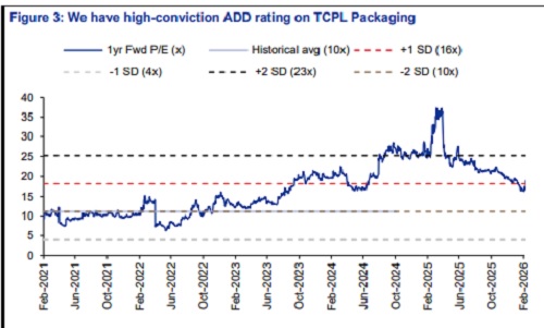 Weakness in exports cushioned by recovery in domestic business TCPL Packaging (TCPL) reported a marginal 1.8% yoy sales decline in 3QFY26, primarily driven by persistent headwinds in the export segment against a high base. While export momentum remained subdued throughout 9MFY26, resulting in a reduced sales mix of 31.6%, the domestic business provided a cushion with low double-digit volume growth. Looking ahead, the domestic segment is expected to maintain this trajectory, supported by FMCG players’ renewed focus on volume growth. However, we anticipate potential nearterm pressure on cigarette carton volumes as the industry navigates sharp price hikes and subsequent impact on industry volume growth