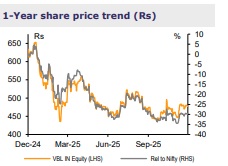 VBL has acquired 100% stake in Twizza (Pty), which manufactures and distributes own branded NARTD beverages in South Africa. With this acquisition, VBL’s volume market share is set to increase to ~20% in the geography by CY27E (vs ~10% now). Among new regions, South Africa gains significance as its NARTD market is large and is ~40% of India’s market, albeit growing at a slower pace (~3% volume CAGR). Though the market is mature, we are confident of a market share-driven double-digit volume growth in the geography, basis VBL’s strong track record for turnarounds in Zimbabwe and Nepal (>50% share now). Portfolio-led pricing gain is also a big opportunity, given ~50% lower realization for VBL vs CCBA, a coke bottler. In addition, Twizza has backward integration lines at all its three facilities, and clusterbased cost synergies should aid profitability gains for its existing operations in the geography (~13% vs ~23% for VBL). The valuation of the acquisition (Rs11.2bn; 1.2x trailing sales vs ~7.5x for VBL) is attractive and is largely in line with historical acquisitions; it provides a 5x-6x value creation opportunity (3-4% of VBL’s M-Cap). VBL’s solid balance sheet (net debt-free vs ~1.0x D/E historically) allows it to pursue growth, presenting scope to capture such valueaccretive opportunities. We reiterate BUY on VBL while revising up our TP (Dec26E) by 7% to Rs615 (vs Sep-26E TP of Rs575 earlier), given consistent outperformance vs FMCG peers and value creation in international geographies.