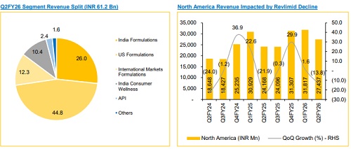 Overall revenue remained strong in Q2, and we expect FY26 growth to remain in double digits. We believe the bulk of the momentum will come from North America and India. In North America, launch activity is expected to accelerate in H2 (15+ launches planned), with Revlimid’s drag reducing from Q4 onward and steady market-share gains in Mirabegron. In India, growth is expected to continue outperforming the IPM, with management confident of being in the first wave of Semaglutide (GLP-1) launches. International Markets and Medtech (acquired from Amplitude) is also expected to deliver double-digit growth.