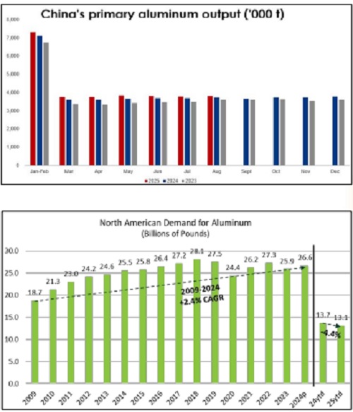 China’s primary aluminum output reached 30.1 million tonnes in January–August 2025, up 2.2% YoY, according to NBS data. August production stood at 3.8 million tonnes, slightly down 0.5% YoY but 0.5% higher MoM. Rising smelting costs, averaging Yuan 16,111/t ($2,262/t), squeezed margins, while aluminum ingot prices dipped marginally to Yuan 20,663/t. Demand was weak early August during the seasonal lull but recovered later, supported by EV manufacturing and power grid investment. Inventories at 16 major city warehouses climbed to 610,000 tonnes, up 85,000 tonnes MoM.