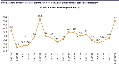 Recovery is now underway across exports markets in the CV, Off-highway space NA Class 6–8 demand is seeing the start of a replacement-led recovery after a prolonged downturn, driven by improving freight conditions, ageing installed base, and better visibility on EPA norm change (wef Jan-27)-related cost inflation (5-7% rise anticipated). Per companies’ management commentary, signs of a pre-buy are visible due to improved regulatory clarity and higher expected truck prices; demand is expected to stay strong through CY26 and into H1CY27. In EU, the heavy-truck market is showing early signs of a replacement-led recovery (25-30% growth expected in the next 2-3Y) aided by ageing fleets and under-replacement in the past few years. In the off-highway/agri space, conditions are turning favorable with decline in the NA Large AG segment narrowing (CY26: 15-20% vs 30% in CY25), EU Large AG segment seeing flat-to-modest growth