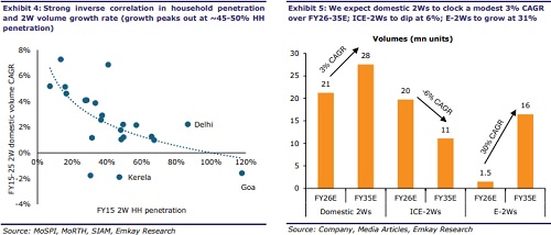 Per our state-wise household and sales analysis, 2W volume growth peaks at 45–50% penetration, showing an inverse correlation between penetration and growth. Over FY15- 25, the top-12 states rose only 1%, while the pan-India growth of 3% was driven by the rest of India (RoI; ‘Hindi’ belt) growing 4%. With RoI penetration at 55% (FY25)—also the level where growth tapered for the top states, 2W volumes face a material slowdown risk over FY25-35E. After the near-term GST-cut led demand spike, we expect the domestic 2W industry to stagnate at 3% CAGR over FY26E-35E. This is likely to coincide with the secular customer-preference shift toward E-2Ws, with volumes expected to rise 13-15x over FY25-35E, and a steep adoption curve akin to that seen during the geared scooters to motorcycle shift during the late 1990s in a base-case scenario. We highlight the possibility of an even steeper curve, as E-2Ws match all the 3 reasons for past mega shifts seen in the 2W industry, ie a) superior cost economics (upfront costs rapidly converging toward ICE-2Ws and operating costs at 1/10th of ICE-2Ws’), b) convenience (automatic transmission, better NVH), and c) futuristic (smart, intelligent, connected). Despite a staggered cut in central and state incentives (eg FAME-II and EMPS) to Rs5k/vehicle in FY26 vs Rs45k in FY23, we see a spike in retail E-2W penetration (7.4/8% in FY26TD/Sep-25 vs 5.8% in FY25) as key category growth barriers of charging, affordability, reliability, and resale value are being addressed.