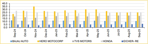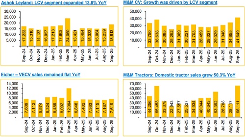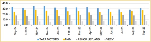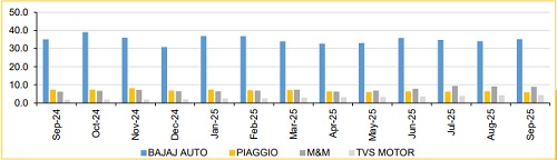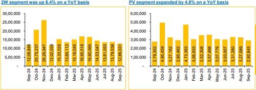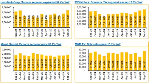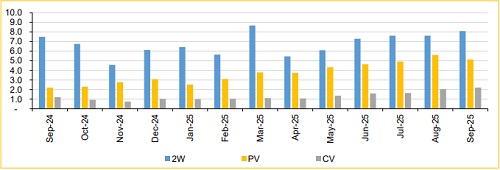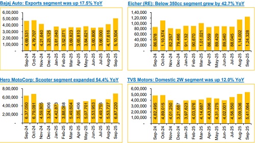* In September 2025, OEMs in the 2W segment recorded strong growth, supported by robust export performance and domestic recovery driven by the festive demand and GST rate cuts. The domestic market saw improvement, with dealers stocking up for the festive season, aided by the GST changes. EIM and TVSL led the segment with YoY dispatch growth of 42.9% and 12.1%, respectively, facilitated by premium motorcycle demand and successful new launches. HMCL posted a 7.9% YoY increase, supported by rural recovery. BJAUT saw a 8.7% increase owing to recovery in the domestic demand and growth of 17.5% in its export segment.