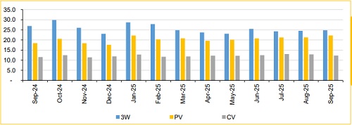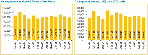 The automotive industry recorded a 5.0% YoY growth in retail sales for September 2025, with all the segments, except 3Ws, expanding on a YoY basis. 2W sales grew by 6.4% YoY, highlighting improvement in demand owing to the onset of the festive season and GST rate change. PV sales improved by 4.8% YoY, led by a healthy demand for both, SUV as well as passenger car, segments. The CV segment saw an increase of 1.5% YoY, whereas 3W sales de-grew by 7.2% YoY. The tractor segment grew by 2.4% YoY. Overall, on a sequential basis, the industry de-grew, largely due to delay of purchases by customers to the last nine days of the month, driven by the GST rate reduction, effective September 22.