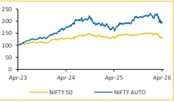 * However, the ongoing Middle East conflict remains a key near-term monitorable, as rising crude oil prices, higher freight rates and commodity inflation (steel, aluminium, copper) could lead to margin pressure for OEMs and auto ancillaries. Higher fuel prices may also affect demand, particularly in entry-level PVs, 2Ws and CVs ? We continue to monitor the developments and may revise our estimates after detailed analysis of Q4FY26 results and management commentary.