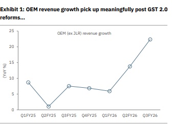 We analyze Q3 performance of listed original equipment manufacturers (OEM). Among our coverage universe, OEM have reported revenue growth of ~22% YoY, with sustained demand momentum post the festival season, led by the GST 2.0 reforms. OEM have seen revenue growth in the range of 5-37% YoY, with TVSL seeing the highest growth. While most OEM have seen EBITDA margin expansion YoY, MSIL and TMPV have seen YoY contraction. OEM have seen healthy average selling price (ASP) expansion; ex-CV, which saw YoY ASP decline, due to weaker mix. Adj PAT growth for the quarter was at ~27% YoY (excluding one-time exceptional item related to new Labor code). TVSL has outperformed peers in terms of adj PAT growth while EIM has seen the highest margin expansion. JLR revenue was down 39% YoY, with EBIT margin at -6.9% vs +9.1% YoY. We tweak our FY26- 28E EPS by 1-7% for OEM (ex TMPV). Post Q3FY26 most OEM has seen earning upgrades.