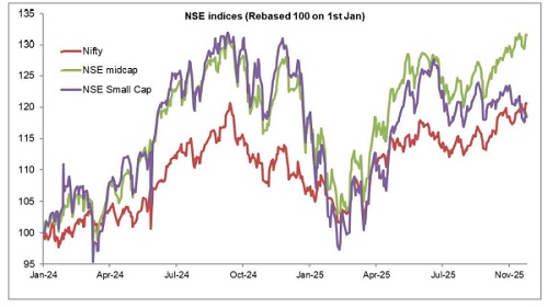 Strong 1500+ points Rally in Nifty 50 since Oct’25: After seeing some pullback in Jul/Aug’25, a broad-based recovery was seen since Oct’25. Nifty 50 saw a comeback with a 1500+ points rally. This was led by 1) Better-than-expected earnings performance for the first half, 2) Optimism building for 15% tariffs for India, 3) Early signs of consumption pickup, 4) Stable currency, 5) Relative attractiveness in valuations vs other emerging markets, and 6) Positive sentiments. Based on the above developments and after almost 14 months of underperformance, Nifty touched the all-time high level of 26,203 on 28th Nov’25 (similar levels were earlier seen in Sep’24). During the same period, the Midcap index is marginally up by 1% while the Smallcap index is still lower by 9%. In the coming weeks, the market will closely monitor developments in the India-USA negotiations on tariffs, RBI monetary policy, US FED meeting outcomes, and other high-frequency indicators.